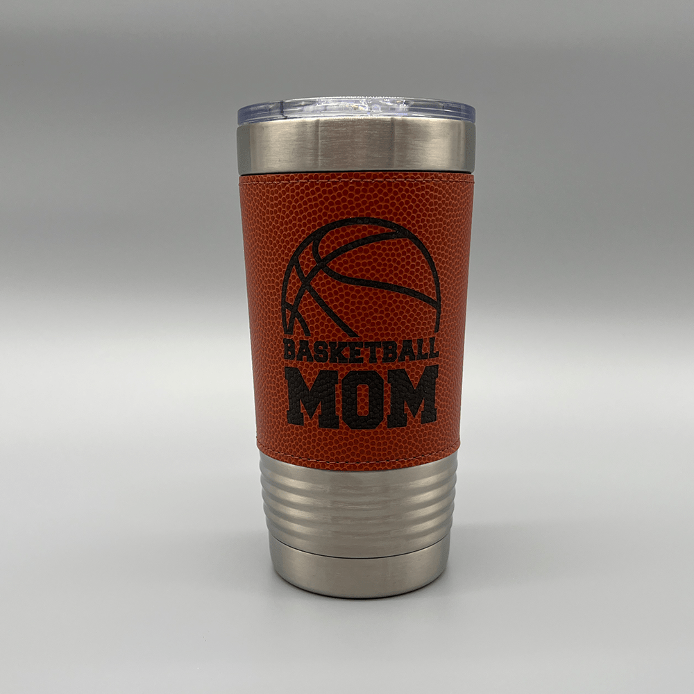 Leatherette wrapped 20 oz. tumbler. Comes with a slider lid to help prevent spills and is tapered at the bottom to fit most cup holders.